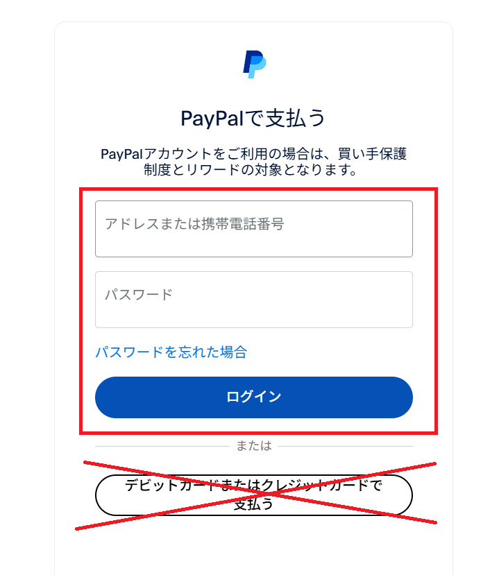 [デビットカードまたはクレジットカードで支払う]は選択しないでください。
